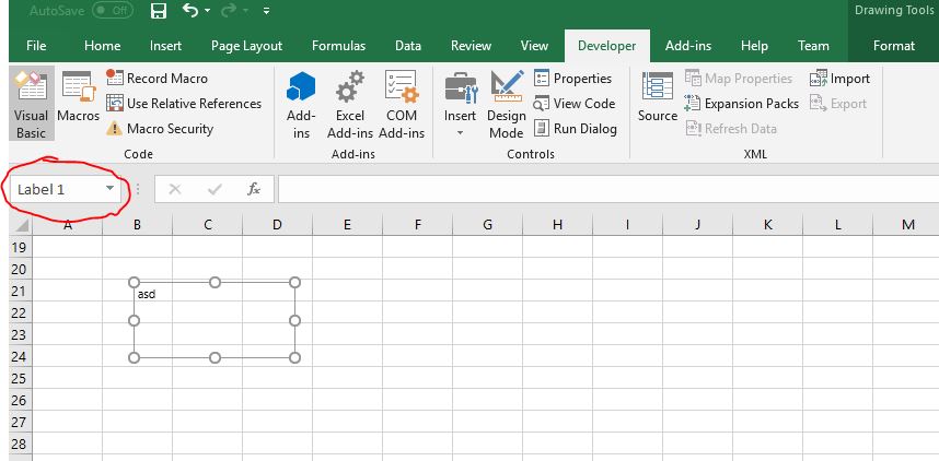ActiveSheet.Shapes("Label 1").TextFrame.Characters.Text = Range("A1").Value