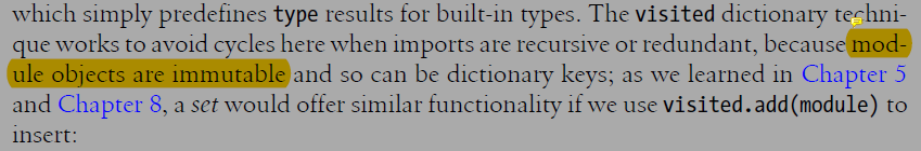 我最近在Mark 2013的“学习Python 5”中读到,python模块对象是不可变的,因此它们可以用作字典键。