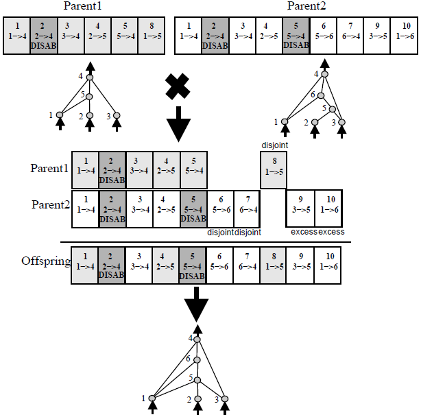 父母1的适应度高于亲本2,不相交的基因6只存在于Parent2中(当然,因为不相交和过量的基因只发生在双亲中),所以不能决定从更适合的父母那里继承这个基因。所有其他不相交和多余的基因也是如此。您只能从它们存在的父级继承它们。