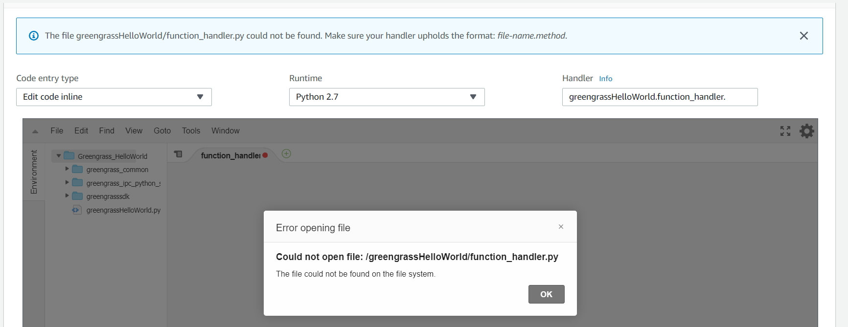 在这里,我遇到了以下问题:我下载了用于GreenGrass核心的python,并将其解压缩。之后,我创建了一个新的Lambda函数并上传了它,得到了以下内容