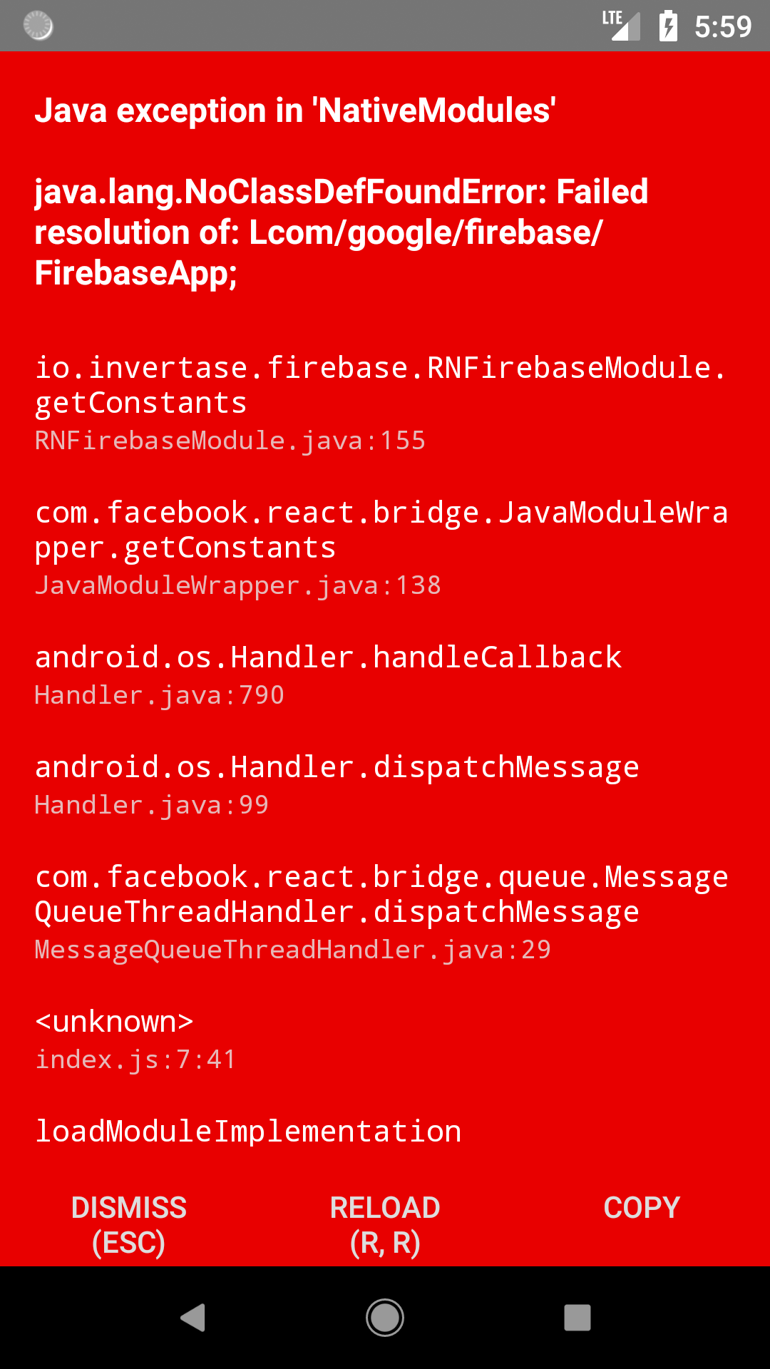 这是React本地项目。在Android仿真程序中成功构建后,我有一个错误: