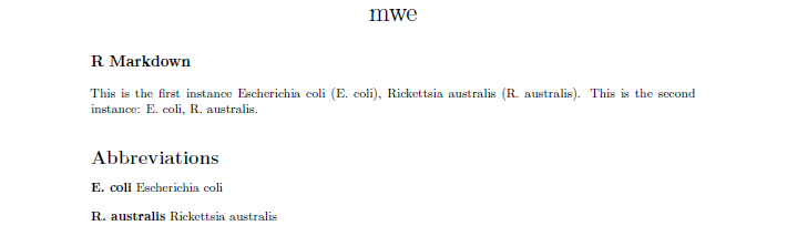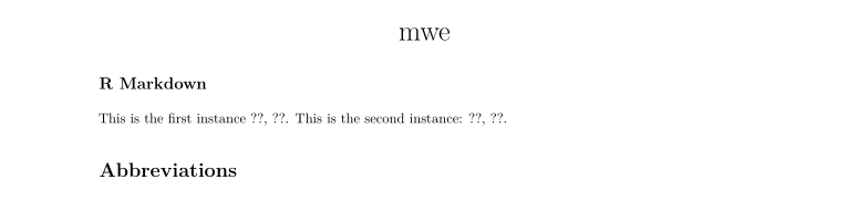 我希望在我的rmarkdown文档中使用bib2gls latex包来插入一个.bib文件中的缩略词列表,当我编织到一个pdf文档时。