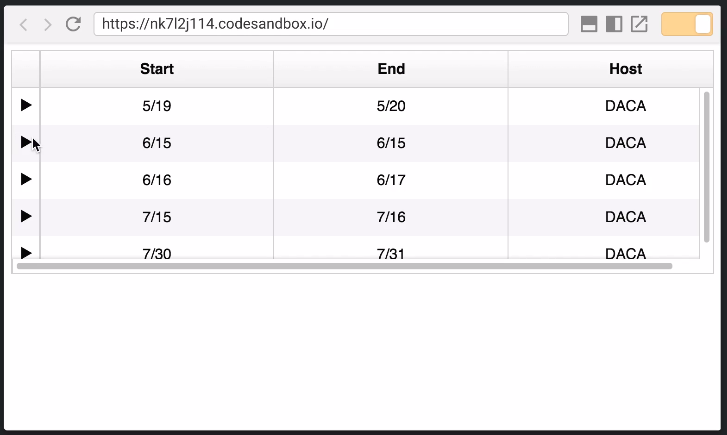 更新--您的代码运行良好。方法的问题是,单击事件是在箭头上触发的,而不是在整个div (或单元格)上触发的。因此,您需要处于点上,只需单击箭头才能展开行。如果您不想要这种行为,我建议将单击事件放在div (或单元格)上。
