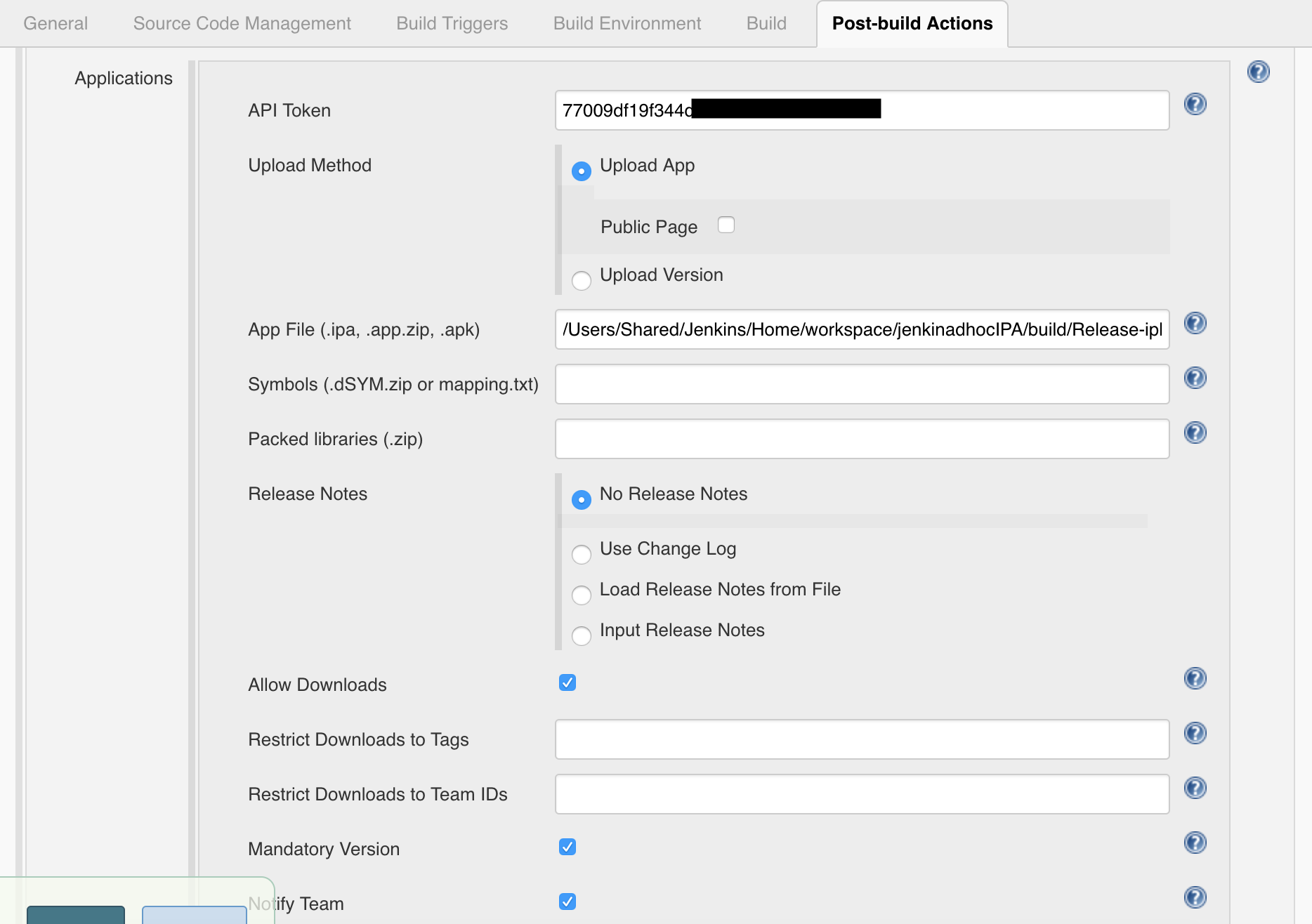 在jenkin的后期操作中,我设置了API Token、App和其他设置。有关详情,请参阅附图。但是,在控制台输出中,我得到以下错误:-