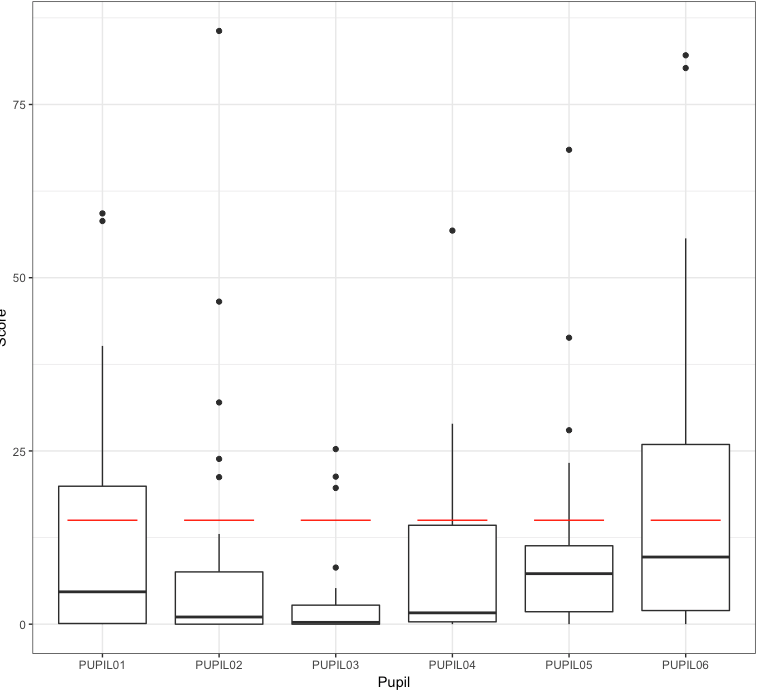 a <- ggplot(data = Variability_datas, aes(x = Pupil, y = Score)) + geom_boxplot() + theme_bw() +