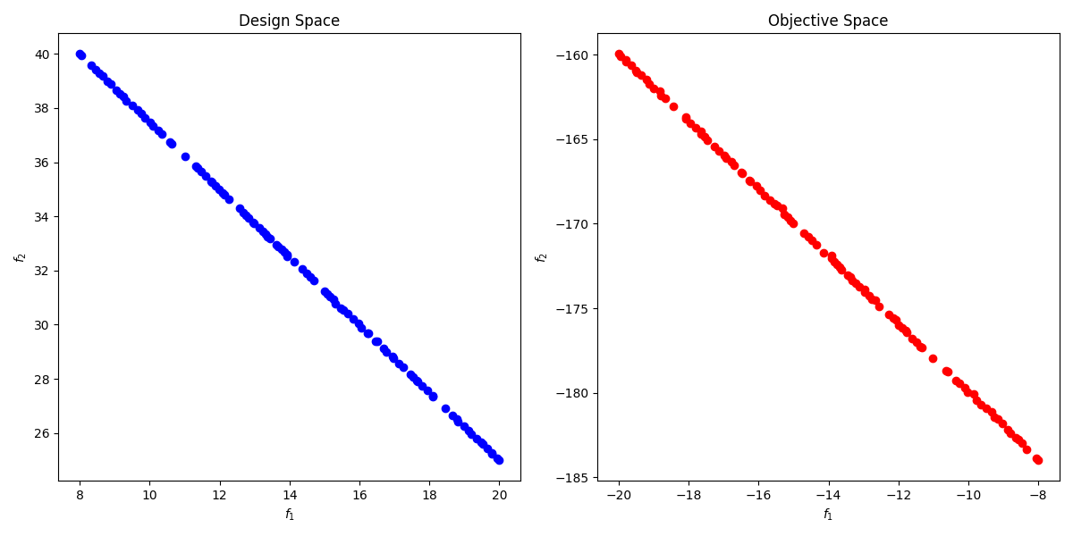您可能需要考虑Python中关注多目标优化的其他框架。例如,在pymoo中,上面提到的相当简单的测试问题的定义或多或少是简单的。您可以在下面找到它的实现。设计和目标空间的结果如下: