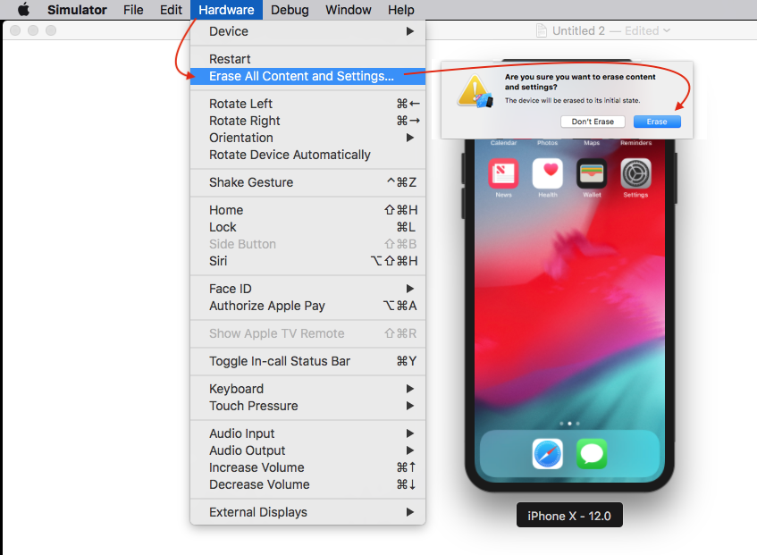 -> Select "Erase Reset Content and Settings..."做完之后再给点时间。关闭Xcode并重新打开它。