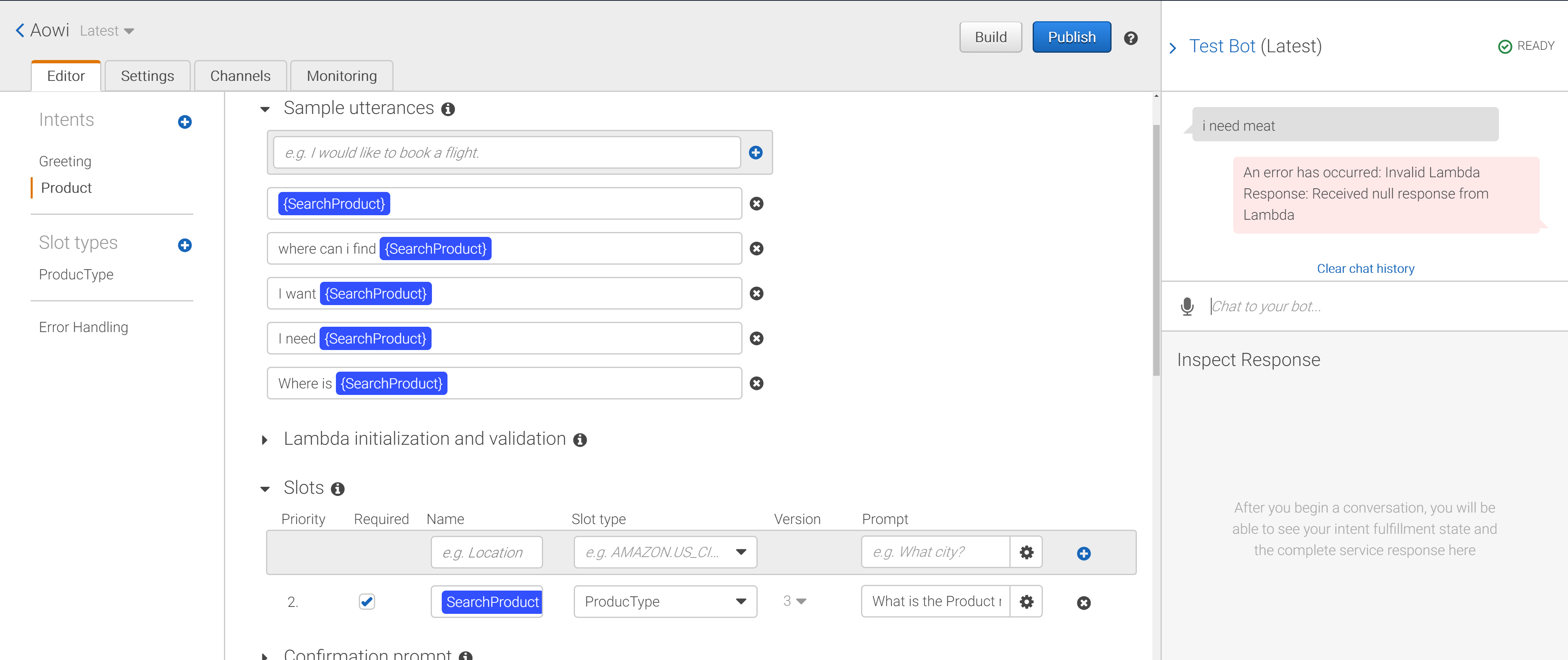 我必须将Amazon和Amazon集成在一起。我遇到了一个问题。我是新来的,所以请帮帮我。我想要一个使用Lex的产品。“在哪里可以找到肉类”,肉类将被存储到插槽'SearchProduct‘,然后它将在数据库中搜索并通过lex回复。比如“我在4号通道找到了肉”