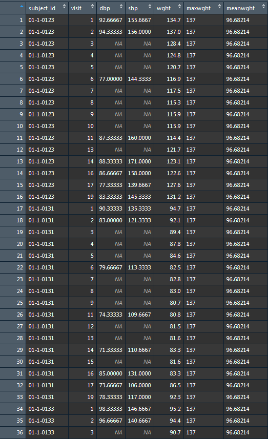 这是你想要的吗?在下面的示例中,输出按subject id显示maxwght列的最大值。例如,如果需要每个主题id的maxwght的平均值,则可以将max()替换为mean。
