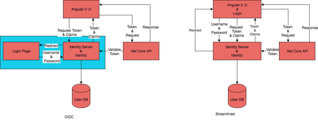 我的理解是,我应该使用带有隐式流的OIDC从角度UI中使用Identity Server进行身份验证。它应该看起来像左边的图表。当我想要一个更流线型的本地登录时,感觉可能更像右边的