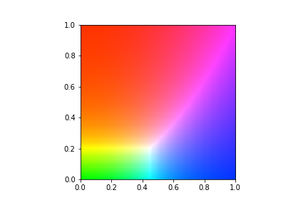 这里可以清楚地看到,对于x和y的小值,其中v和w是零,颜色是绿色的,因为u不同于零,比v和w大得多。对于大x和小y,w占主导地位,颜色确实是蓝色,而当v占主导地位(大y和小x)时,颜色是红色。还表明,对于所有三个矩阵的等值,得到的颜色是白色的。