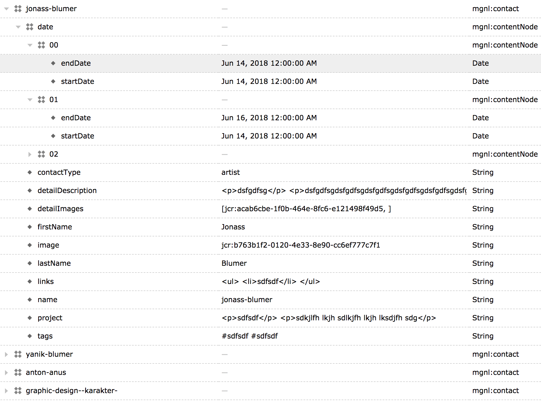 - Event1 -- Dates --- 0 ---- startDate: xyz ---- endDate: xyz --- 1 ---- startDate: xyz ---- endDate: xyz - Event1 -- Dates --- 0 ---- startDate: xyz ---- endDate: xyz --- 1 ---- startDate: xyz ---- endDate: xyz