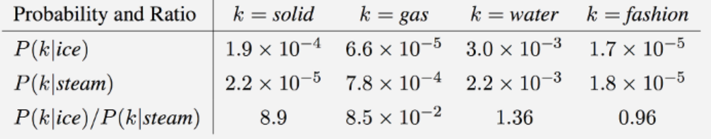 正如人们所预料的那样,“冰”与“固体”的共同发生比与“气体”发生的频率更高,而“蒸汽”与“气体”发生的频率比与“固体”的共同发生的频率更高。这两个词经常与它们的共有财产“水”同时出现,而与不相关的词“时尚”也很少同时出现。只有在概率比中,“水”和“时尚”这样的非歧视性词汇的噪音才会抵消,因此大值(远远大于1)与“冰”特有的属性有很好的关联,而小值(远小于1)与“蒸汽”的特性有很好的关联。通过这种方法,概率比可以表示与热力学相抽象概念相关联的某种粗糙的意义形式。