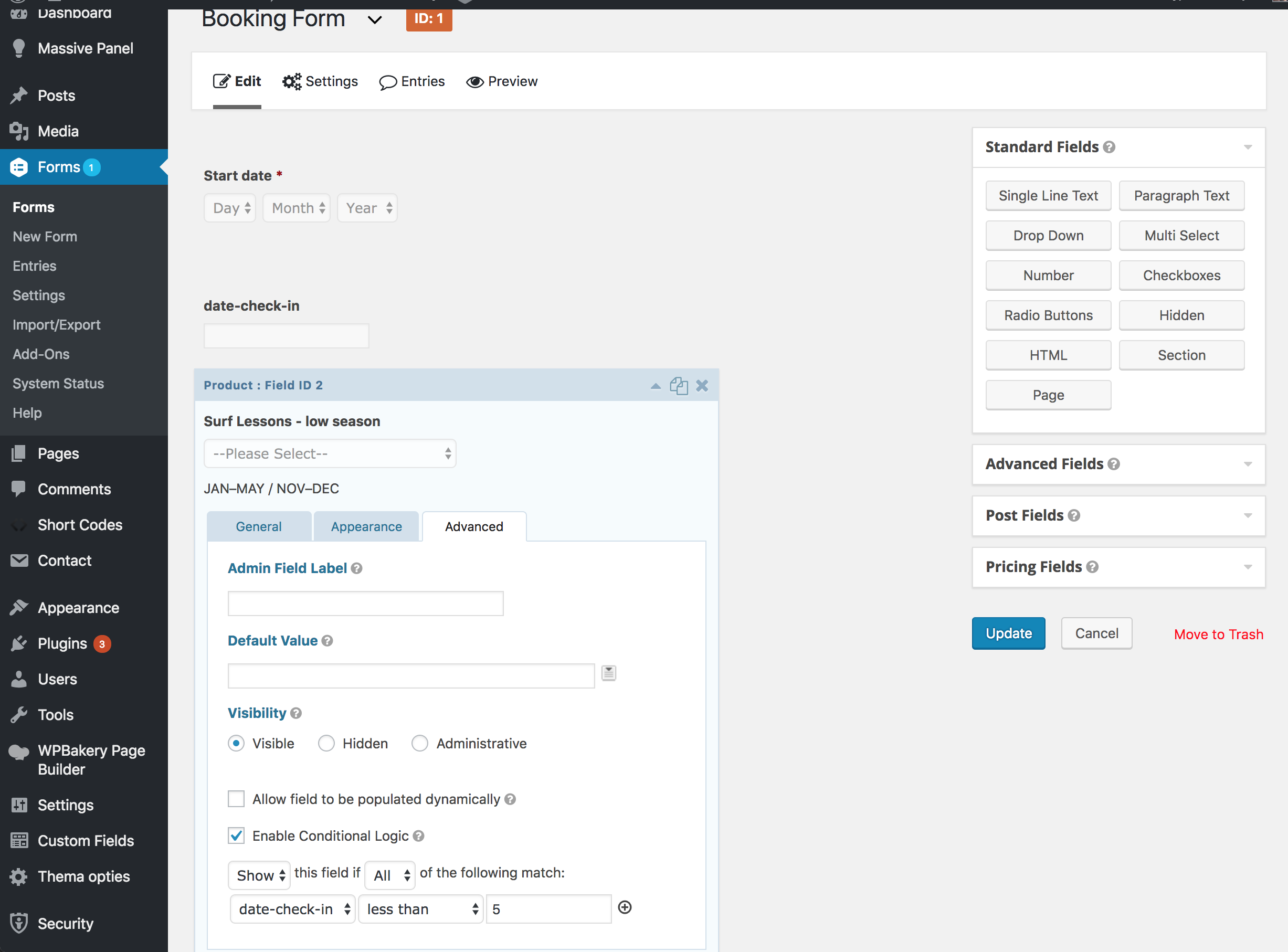 关于这个问题的一些背景资料。当某个月在日期字段中被选中时,我想要一个字段变得可见。由于重力窗体不支持基于日期字段的“条件逻辑”,所以我希望用“月份值”更新隐藏字段,然后在相关字段中使用该值作为“条件逻辑”。