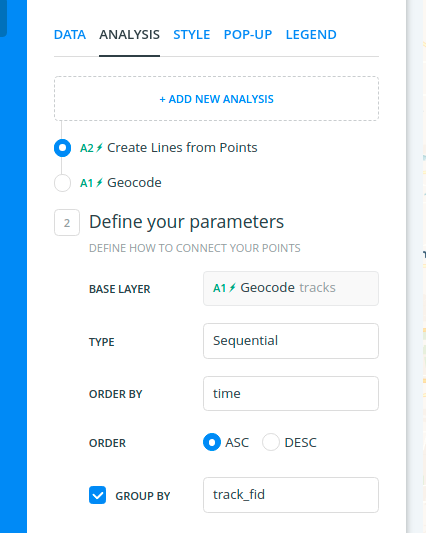 如果使用的是构建器UI,可以添加分析,按time排序,并按track_fid字段(或track_seg_point_id,不知道要使用哪个字段)对行进行分组: