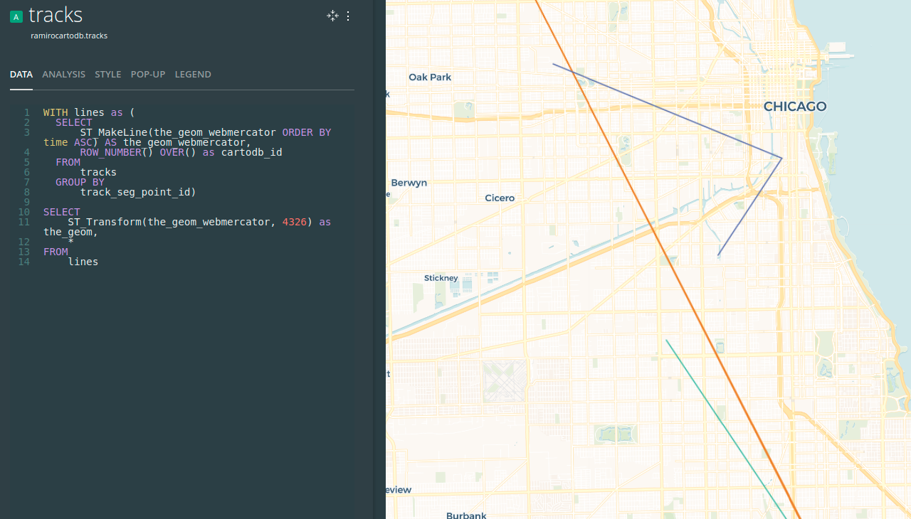 我正在使用Cartodb地图一些GPS点,我想连接独特的ID与线。在编写SQL时,我使用这个站点作为引用。SQL执行时没有任何错误,但我的映射没有生成。