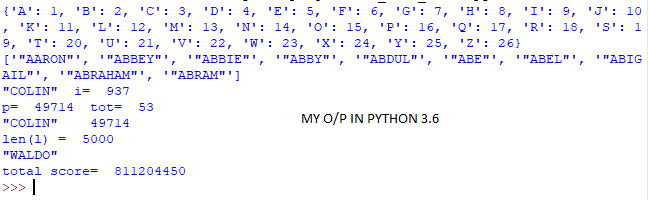 使用names.txt (链接:names.txt),一个46K的文本文件,包含超过5000个名字,从按字母顺序排序开始。然后计算出每个名称的字母值,将该值乘以其在列表中的字母位置,以获得名称得分。例如,当列表按字母顺序排序时,COLIN (值为3 + 15 + 12 + 9 + 14 = 53 )是列表中的第938个名称。所以,科林会得到一个分数的938 × 53 = 49714。文件中所有的名字分数的总数是多少?