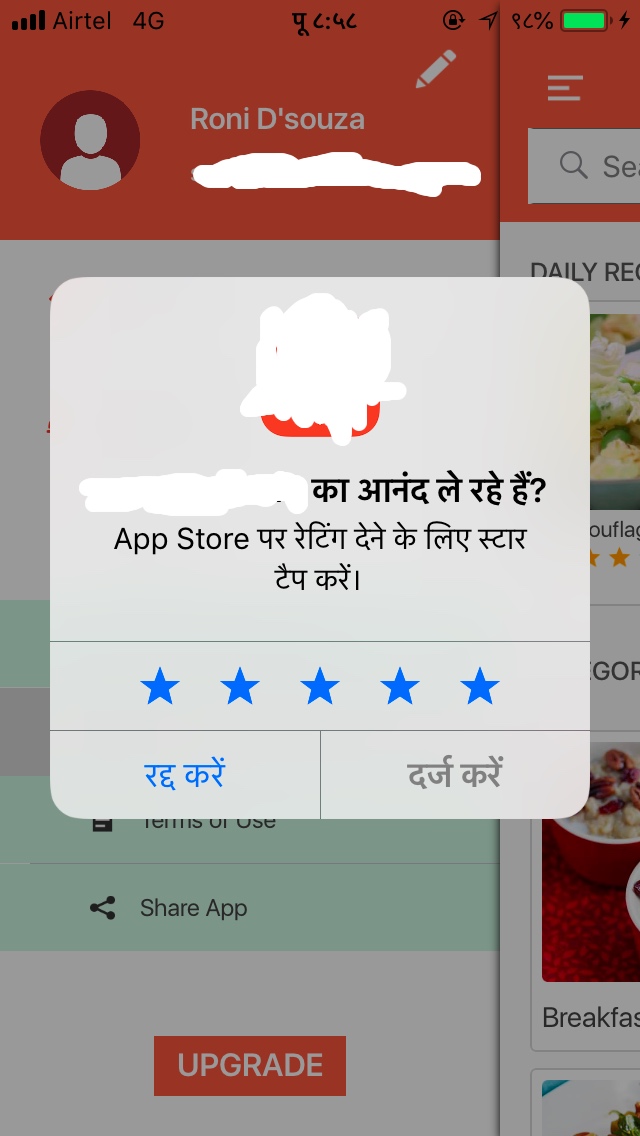}在开发模式下,它正在正常工作&我可以得到这样的PopUp :但是在从应用商店下载的Live中,应用程序没有显示这个评级弹出,如果用户按下评级按钮,什么都不会发生。