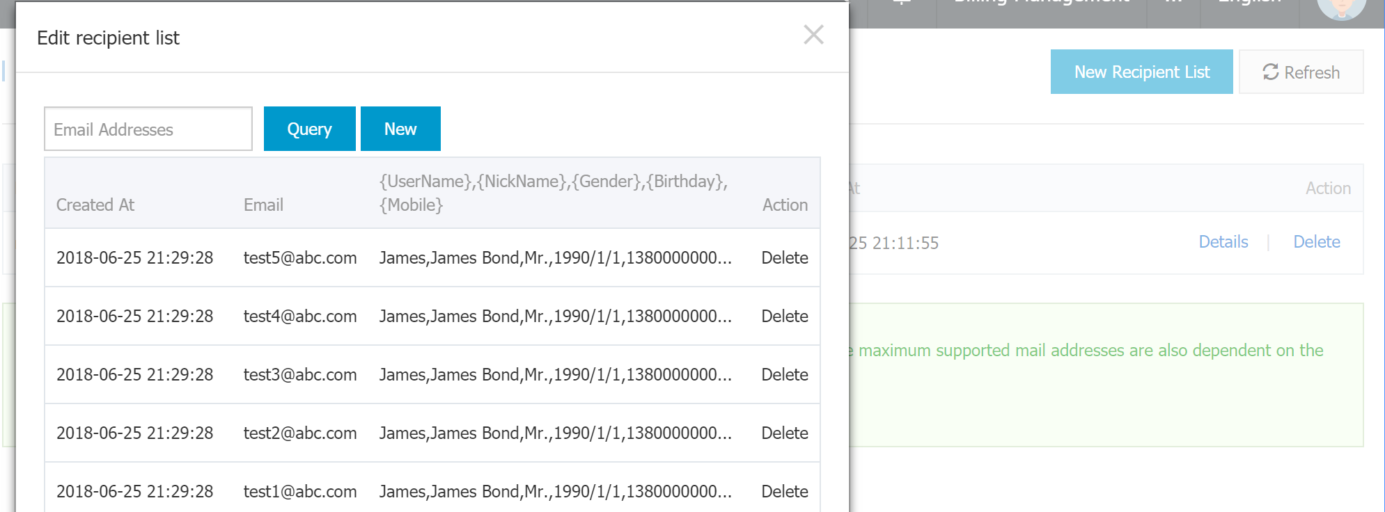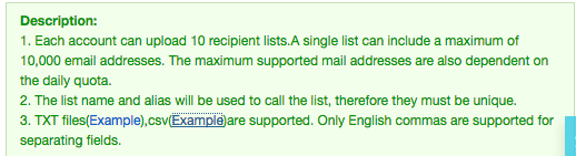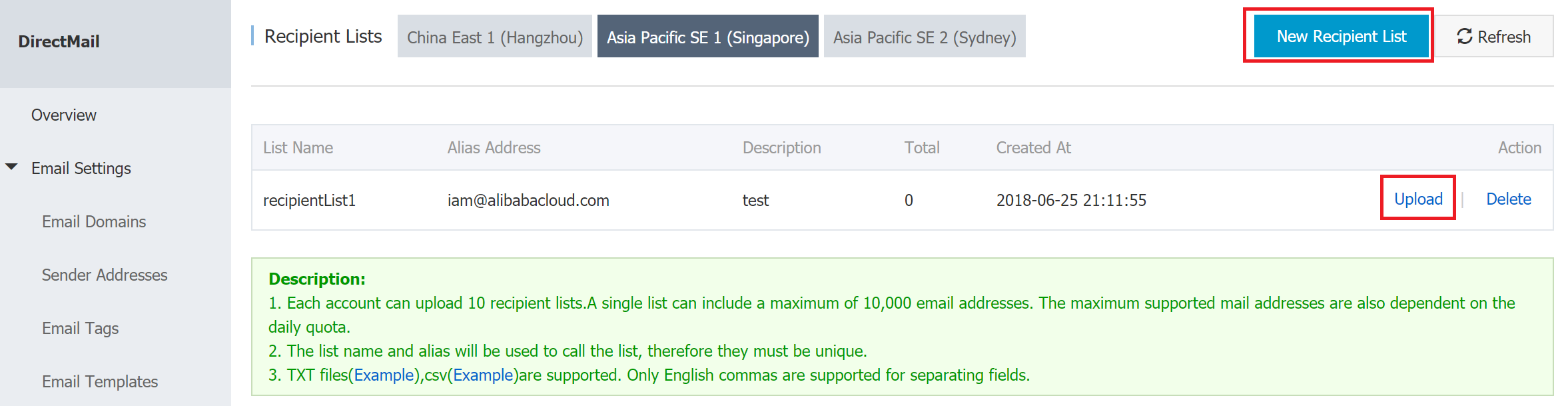 我想展示如何将收件人名单上传到阿里巴巴云控制台,因为这些信息在文档中是不可用的。