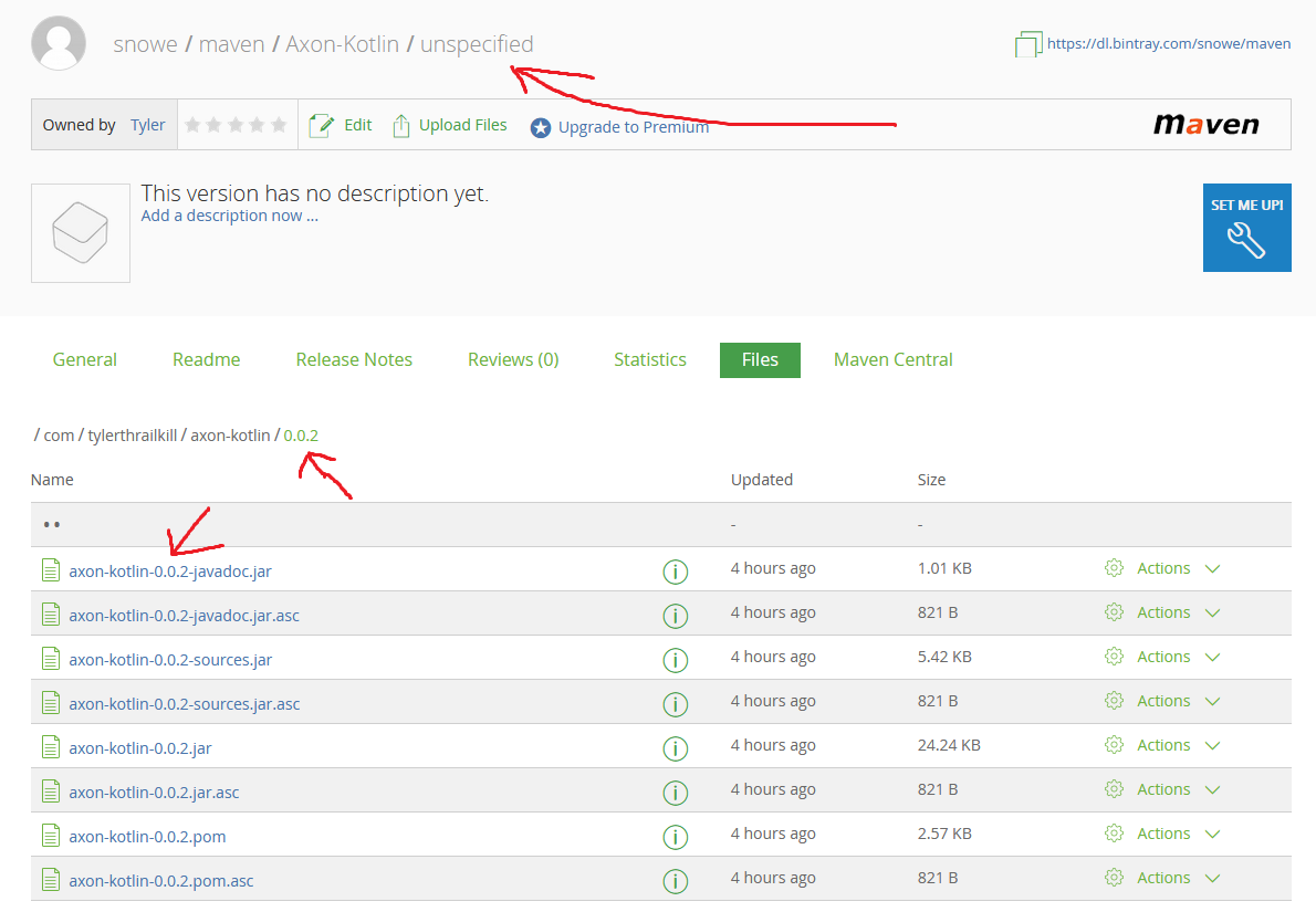 Could not upload to 'https://api.bintray.com/content/[secure]/maven/Axon-Kotlin/unspecified/com/tylerthrailkill/axon-kotlin/0.0.2/axon-kotlin-0.0.2-sources.jar': HTTP/1.1 409 Conflict [message:Unable to upload files: An artifact with the path 'com/tylerthrailkill/axon-kotlin/0.0.2/axon-kotlin-0.0.2-sources.jar' already exists]忽略它已经存在的部分,我只是一遍又一遍地尝试使用相同的版本号,直到路径正确。