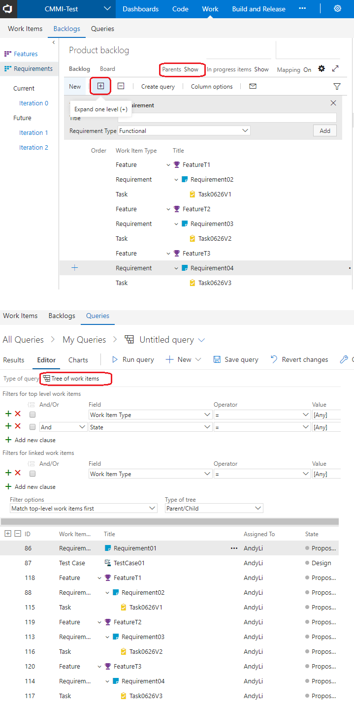 Parents设置为Show,然后单击展开+图标以展开层次结构的one level (单击两次以展开两个级别)。请参阅显示父级并展开树的层次结构。Tree of work items)查看多层嵌套的工作项列表.请参阅使用树查询查看层次结构