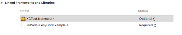 dyld:库未加载:@rpath/XCTest.framework/XCTest引用自: /Users/shoaibahmedqureshi/Library/Developer/CoreSimulator/Devices/CBC381BC-854F-41D6-8D4C-90C2850459AD/data/Containers/Bundle/Application/095CDEFA-A79A-4235-B046-68277D5C14EB/EasyGridExample.app/EasyGridExample原因:图像未找到