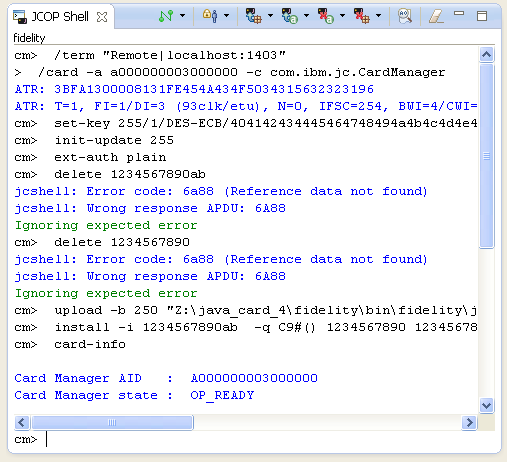 我当时正在Eclipse上开发一个JCOP的小程序。但是突然之间,无论我如何清理和尝试创建新项目,JCOP Shell (JCShell)都会有选择地忽略发送进来的命令的一些输出。我不知道是怎么回事。而且似乎没有任何与我如何设置JCShell相关的手册。