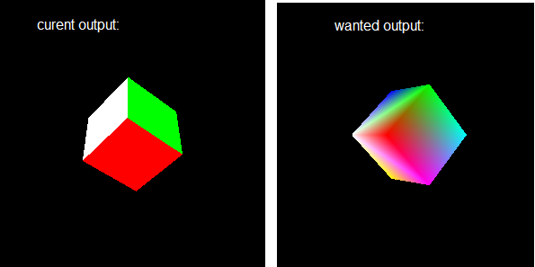 我试图在一个3D立方体中获得颜色插值/颜色渐变,我听说这是默认的,但由于某些原因它不起作用。看起来它使用的是glShadeModel(GL_FLAT),而不是我声明的。我做错了什么?