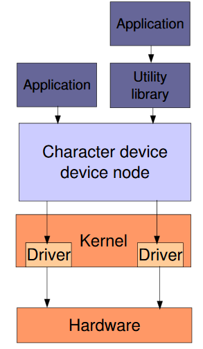 我还读到,作为一种常见的模式,与设备驱动程序的交互是通过字符设备驱动程序完成的,该驱动程序在用户空间中被访问,并负责与设备驱动程序的交互(详见下图)。