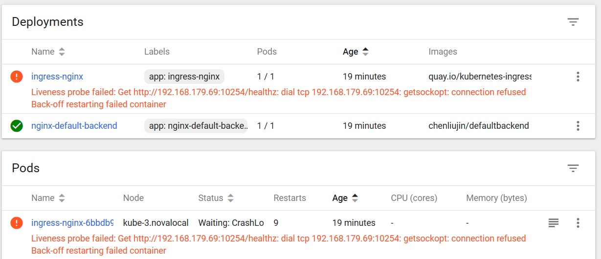 ingress-nginx-59b74f9684-lgm2k 0/1 CrashLoopBackOff 9 20m 192.168.179.5 kube-3.novalocal