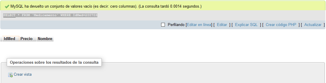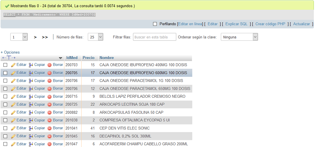 SELECT * FROM `Medicamento` WHERE IdMed>200702 结果: