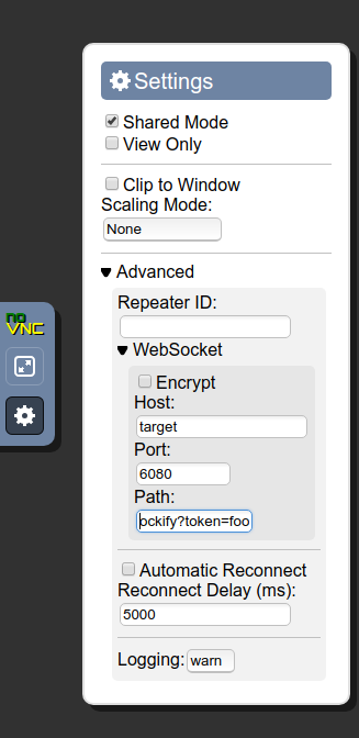 如果要更改noVNC使用的noVNC路径,可以通过设置或使用" path“查询参数进行更改。以下是设置位于noVNC UI中的位置: