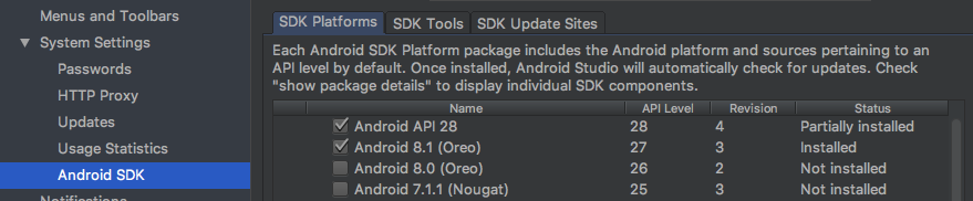 步骤1:在Android中打开首选项或设置。选择Android选项并安装Android 28,如下所选。