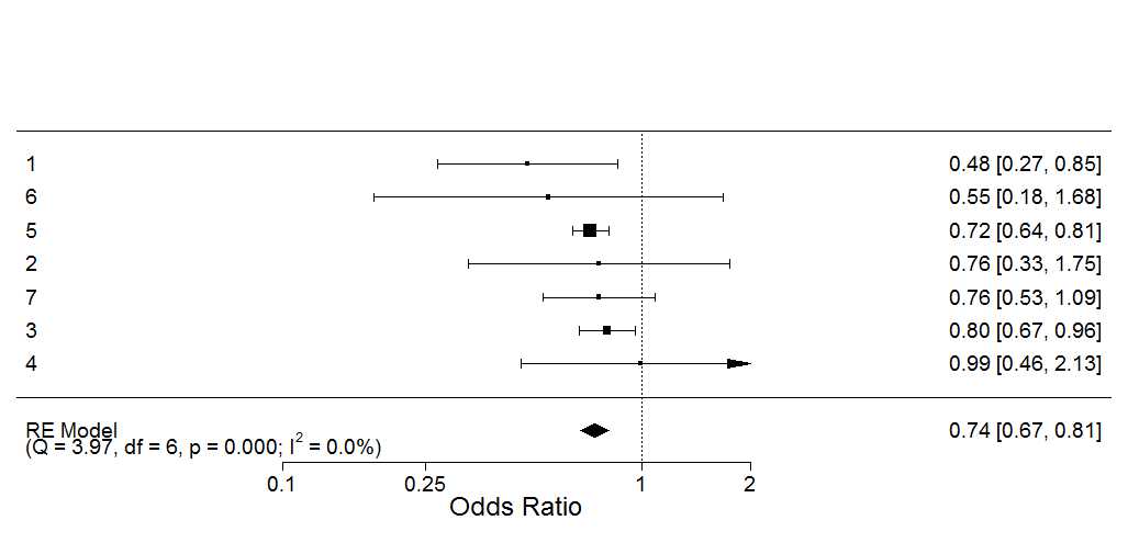 res <- rma(yi=beta, sei=se, slab=(1:7), measure="OR",data=SIPVdata, digits=3, method= "ML")