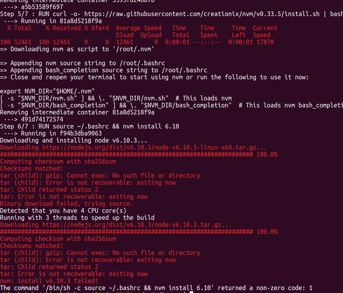 RUN source ~/.bashrc && nvm install 6.10