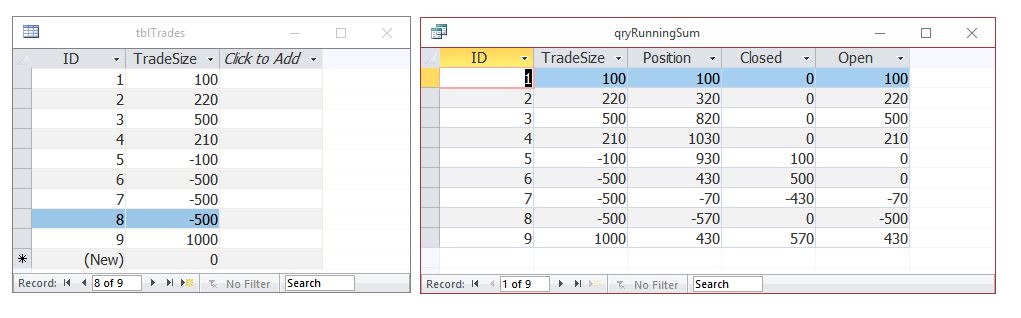 SELECT T.ID, T.TradeSize, (SELECT SUM(TradeSize) From tblTrades TS WHERE TS.ID <= T.ID) AS [Position], IIf(Sgn([TradeSize])*Sgn([Position])<0,-[TradeSize],IIf(Abs([TradeSize])>Abs([Position]),[TradeSize]-[Position],0)) AS Closed, IIf([TradeSize]=-[Closed],0,[TradeSize]-[Closed]) AS [Open] FROM tblTrades AS T;