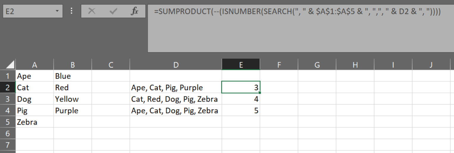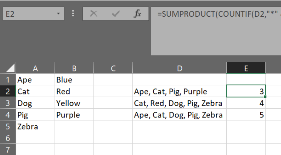 =SUMPRODUCT(COUNTIF(D2,"*" & $A$1:$A$5 & "*"))它还有一个限制,即amimals不是子字符串,比如Ant和Ant-Eater。