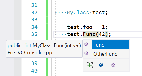 Intellisense应该集中在函数名上,并将显示完整的函数签名和访问。在下面的屏幕截图中,光标位于'c‘结尾的Func和括号之间。