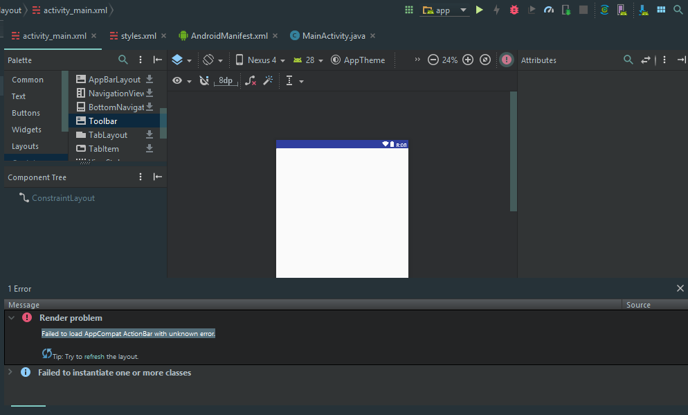 问题是应用程序没有actionbar,尽管style.xml有适当的代码,即使通过更改Layout_width、Layout_height和将其约束到约束布局,工具栏也不会出现。