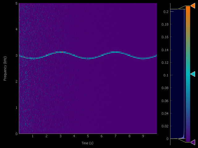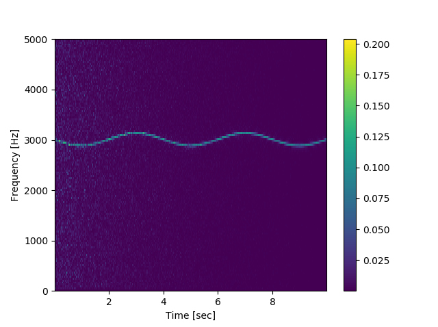 该谱图的输出可以很容易地绘制为一个ImageItem从比例尺。通常情况下,产生的光谱图只在灰度范围内。您可以很容易地使用直方图来调整这一点。
