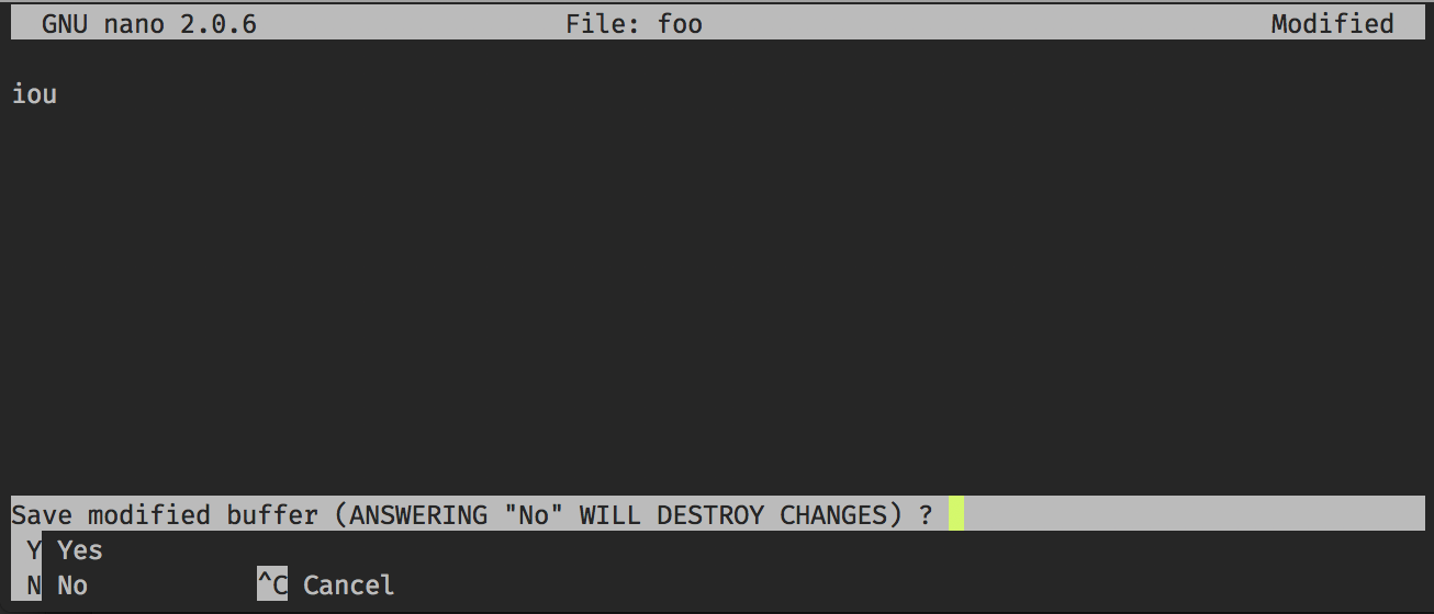 按Ctrl+x (^X)键“退出”,然后按下明显的键保存您的工作: