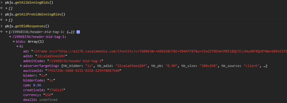 pbjs.getAllPrebidWinningBids()返回一个空数组