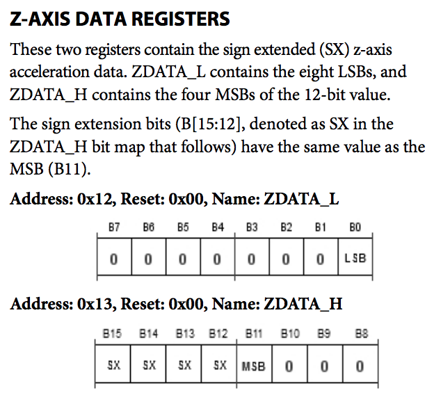 我正在查询一个ADXL362数字输出微机械加速度计的轴数据,它作为两个8位寄存器,结合给出一个12位的值,我试图找出如何组合这些值。我从来不擅长按位操作,所以任何帮助都是非常感谢的。我可以想象是这样的:
