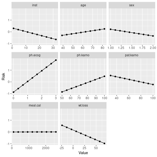n= 167, number of events= 120如果你对独立于学习者的互动性感兴趣,那么你可以看一看部分依赖情节。对于coxph,它们并不是惊人的线性:
