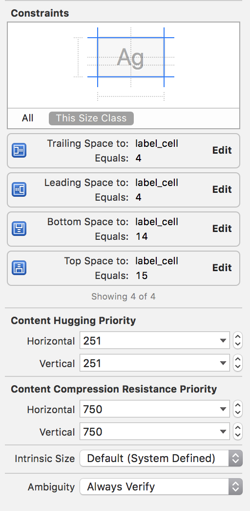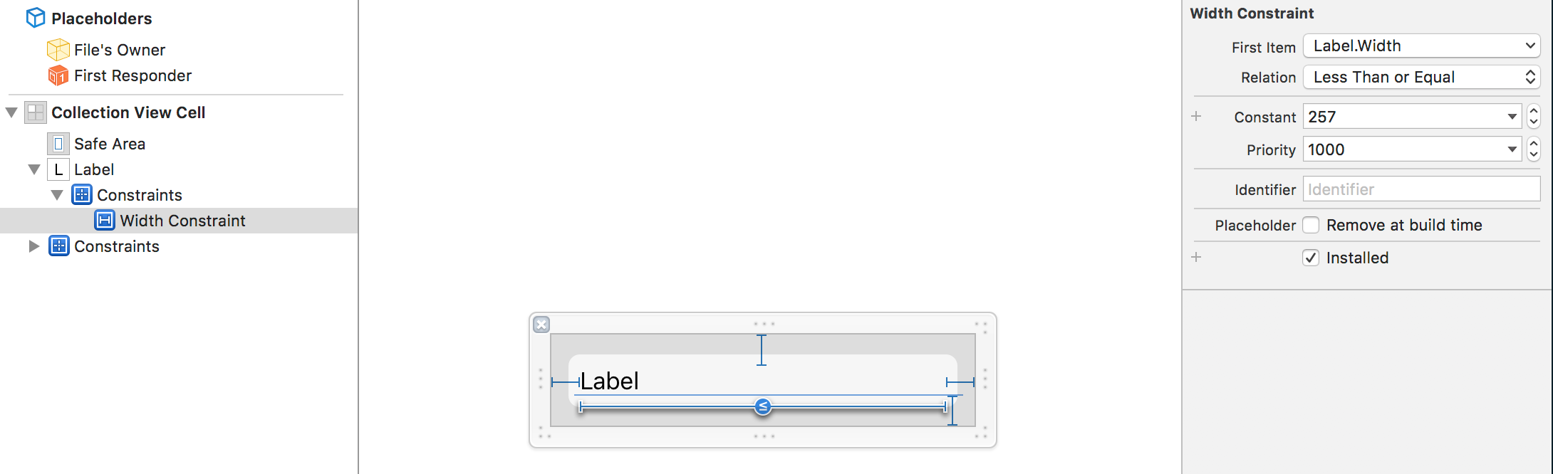 下面是如何修复它,将width约束添加到UICollectionViewCell子类中的标签中,并将其设置为less than equal而不是equal。