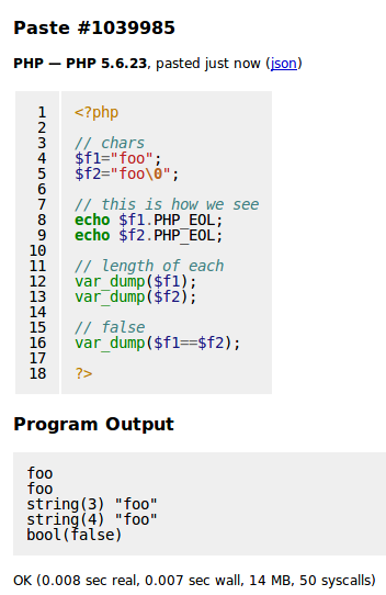 $ php -r '$f1="foo"; $f2="foo\0"; echo $f1.PHP_EOL; echo $f2.PHP_EOL; var_dump($f1); var_dump($f2); var_dump($f1==$f2);'