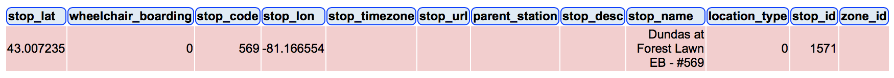 应该注意的是,停止代码为569,停止id为1571。根据GTFS文档,用户通常会搜索停止代码(569),但内部搜索的是停止id (1571)。这些文件来自GTFS包中的stops.txt文件。
