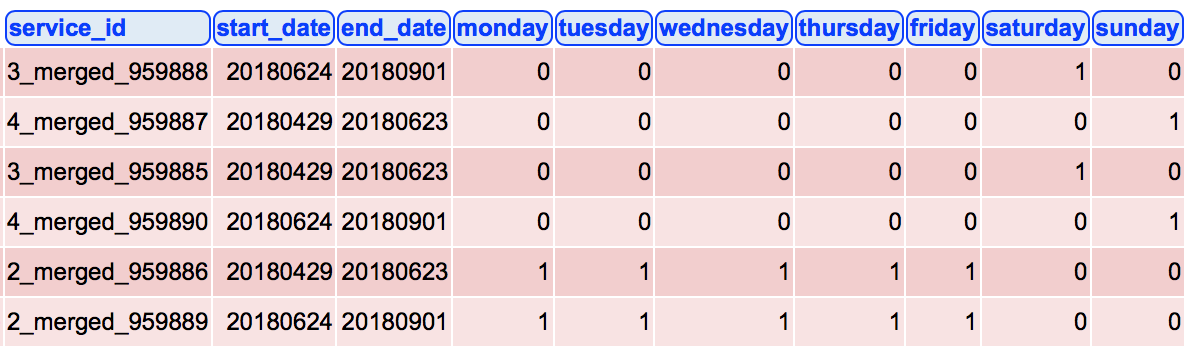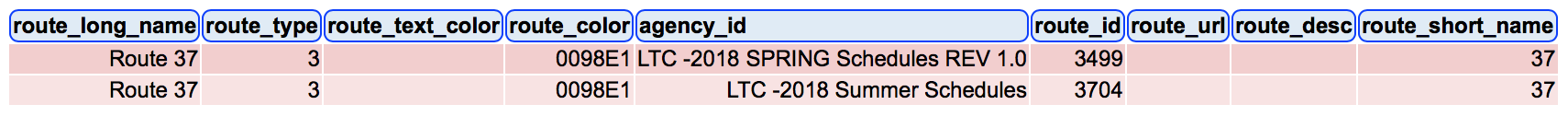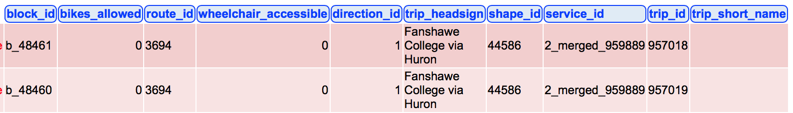 ORDER BY routes.route_short_name, trips.service_id, stop_times.departure_time这是相关的表格。我按照GTFS文档中指定的方式将数据存储在数据库中。
