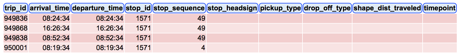 我的目标很简单。在我的应用程序中,用户会按下一个停止,它会打开一个屏幕,显示经过该站的每条路线(总线),并显示每条路线在该站下的2个停止时间。当用户按下停止id为1571的停止时,我想显示什么: