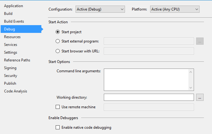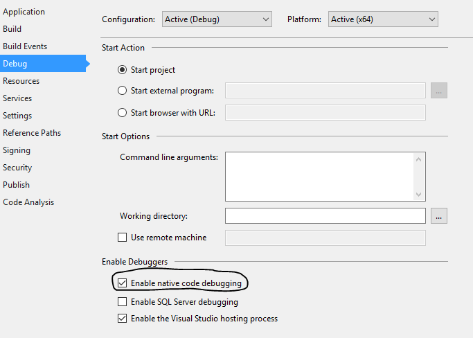 在“启用调试器:”一节中,检查“启用本机代码调试”。